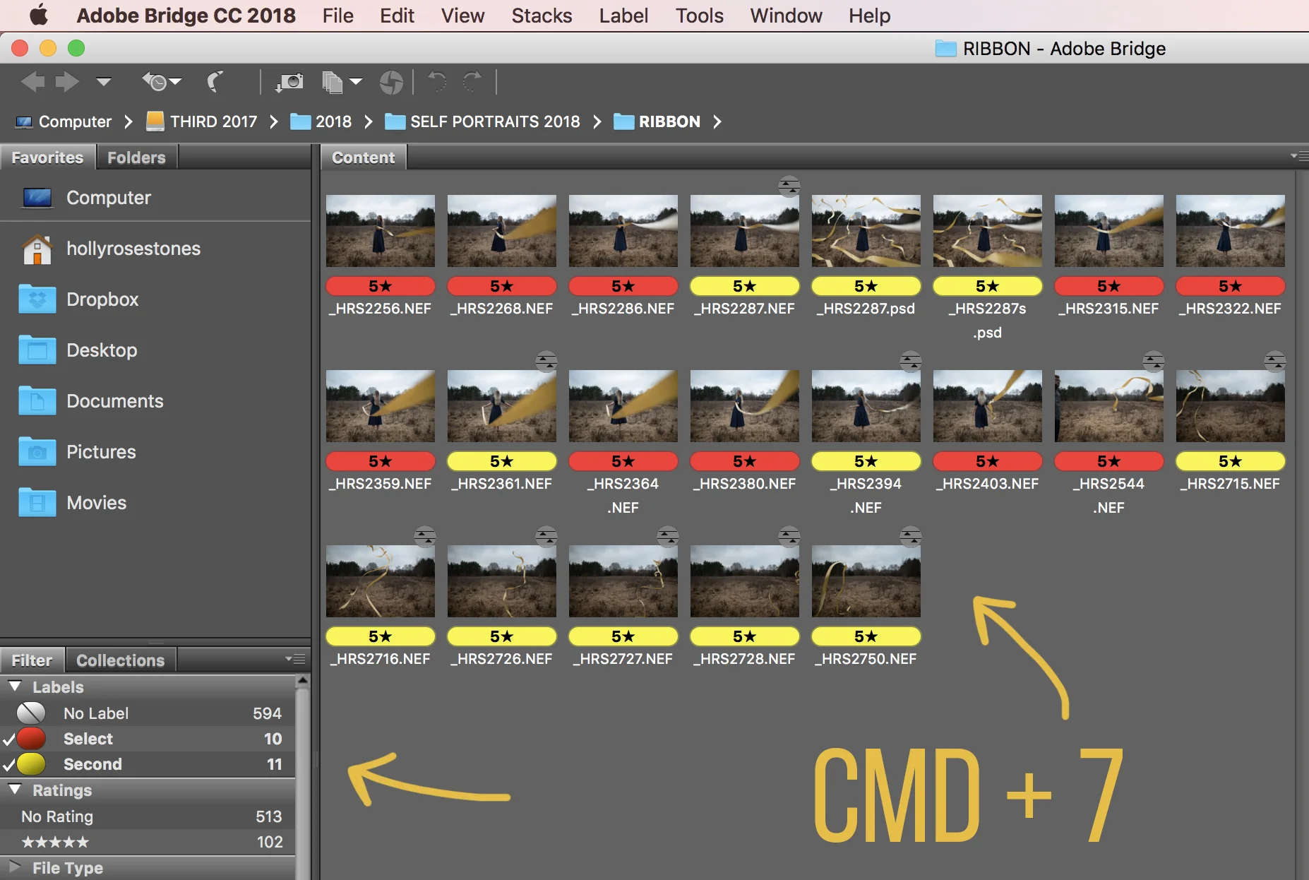 Once I have a selection of images that is easier to manage, I then go through a third time and label the images with a 'Yellow Label' (the correct term is 'Second' in Bridge, but aint' no body got time for that!)